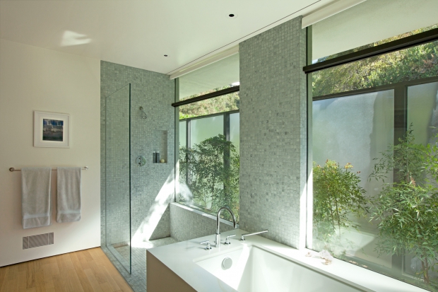 The guest bathroom with it’s full-height window to the garden. The shower/tub is defined by mosaic marble walls, and the vanity is a floating walnut cabinet with a white Caesarstone top.
