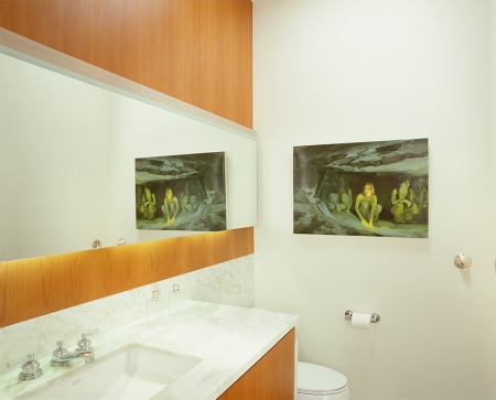 The new bathroom with a horizontal ribbon of mirror, underlit. A marble wainscot unifies that wall and its elements.